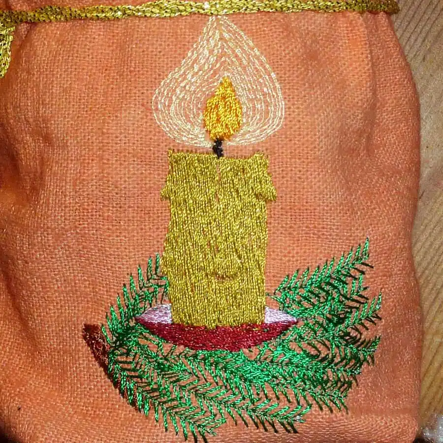 Christbaumkerze mit Tannenzweig. Stickdatei für die Weihnachtszeit, sorgfältig digitalisiert mit 8 Farben.