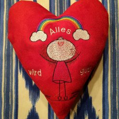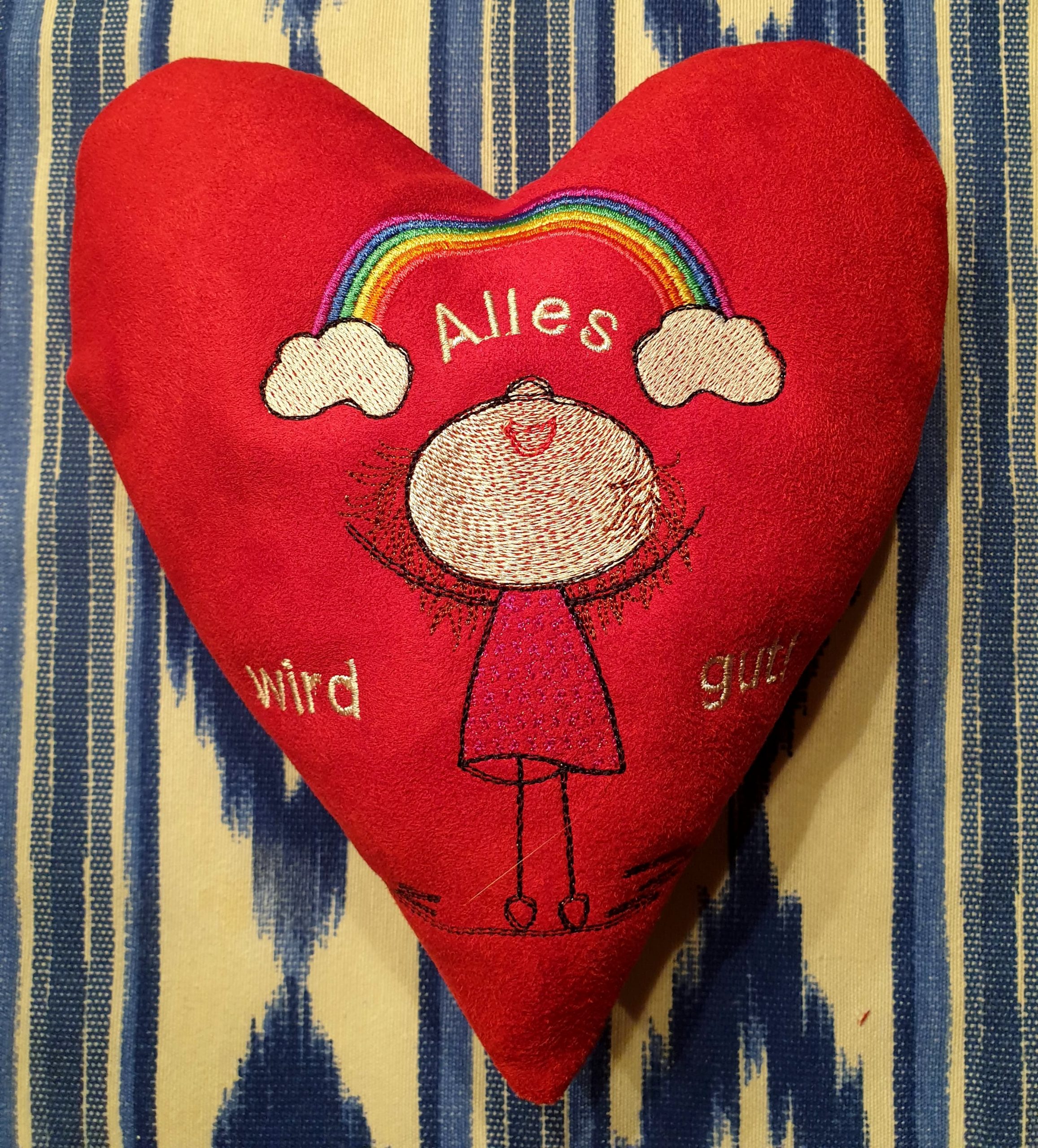Es wäre eine große Freude für mich (und sicher auch für viele andere), wenn du beispielsweise mit dem Motiv Lilly Regenbogen Kostprobe nach dem Schnittmuster Herz Kostprobe ein besticktes „Lilly-Herz“ nähen könntest.