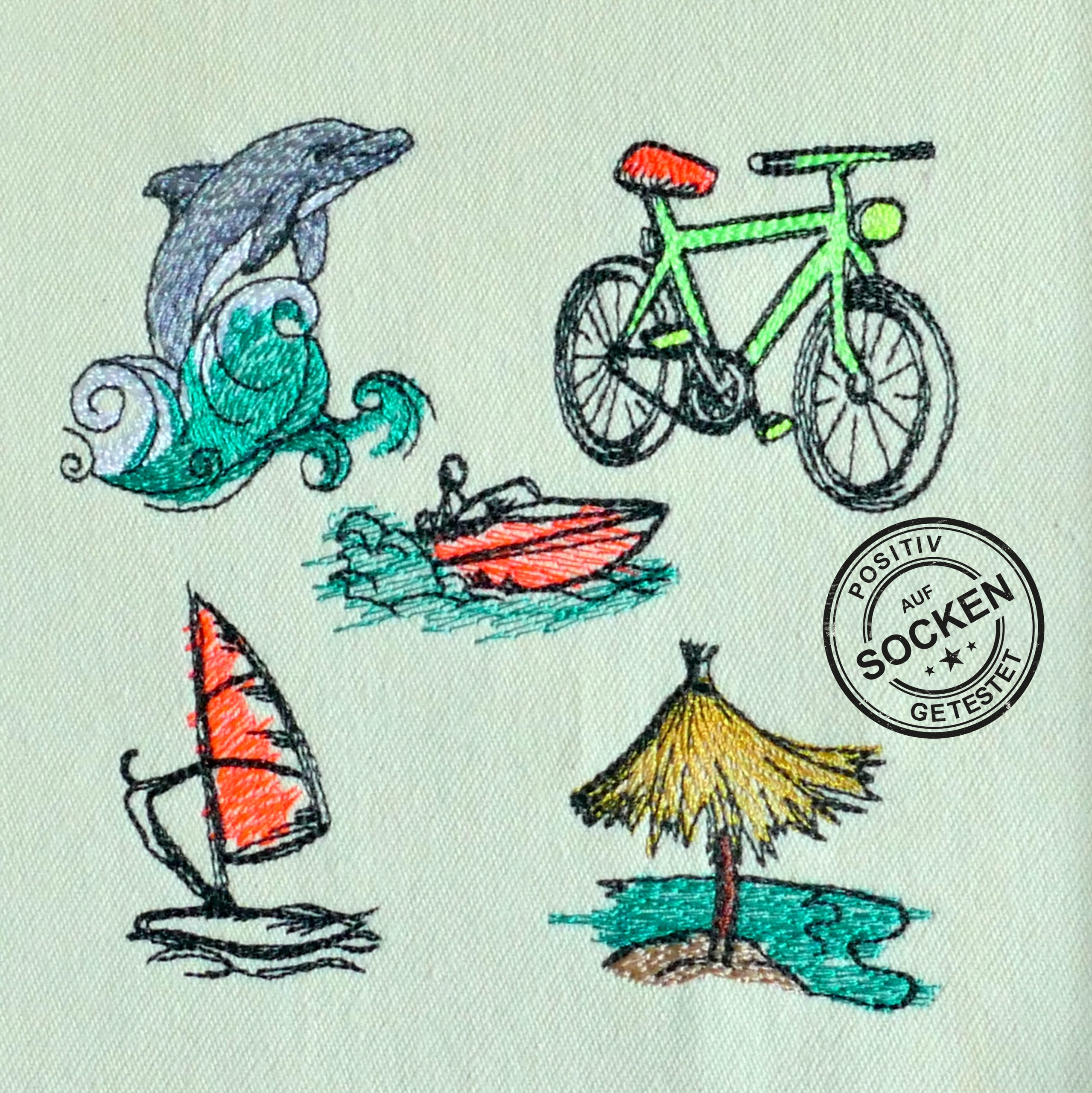 Erkenne, ob sich kleine Motive für das Besticken von Socken (oder auch Handschuhe aus Strick- oder Jersey-Stoffen) eignen und finde bei den entsprechenden Motiven den Stempel „positiv auf Socken getestet“.