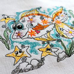 Durch nicht zu überladend gesetzte Farbdetails ist dieses Motiv hervorragend geeignet, auf hellen Stoffen sein Plätzchen zu finden und ist dadurch relativ schnell stickbar.