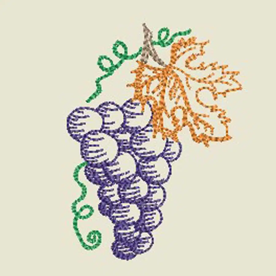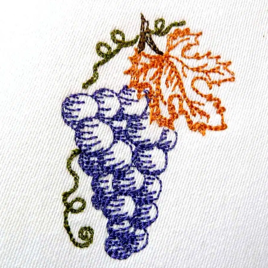 Eine wunderschöne Trauben-Rebe in Skizzenart gestickt – dadurch erscheint sie besonders leicht und apart.