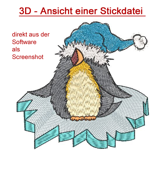 Es gibt in jeder Stickdateien-Software die Funktion eine sogenannte „3D-Stickansicht“ einzustellen.